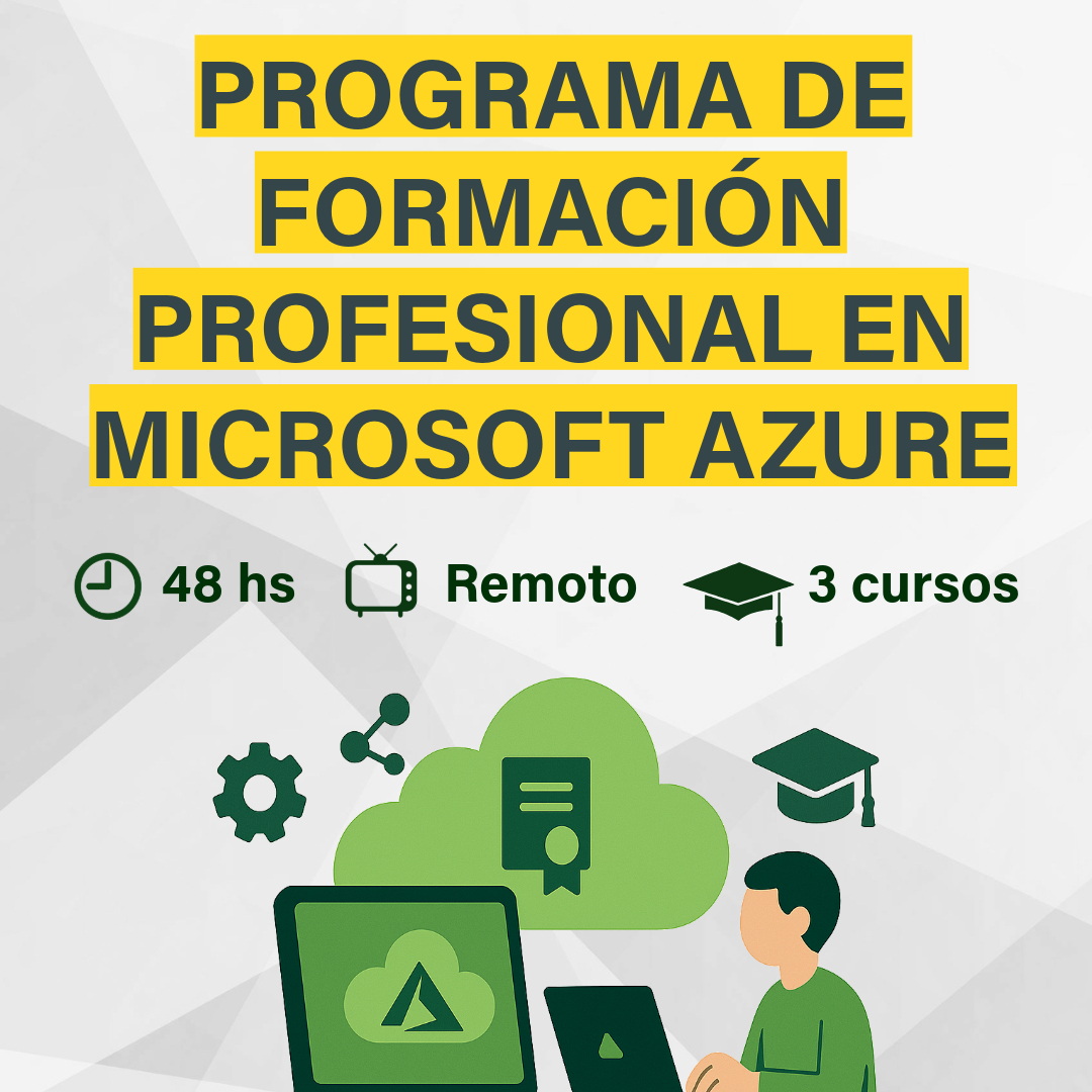 El Programa de Formación Profesional en Azure es una carrera educativa completa basada en Azure, Inteligencia Artificial y prÔcticas DevOps. Incluye el acceso a 3 cursos de formación profesional que cubren fundamentos de computación en la nube (con foco en Azure), fundamentos de Inteligencia Artificial aplicada e(con servicios de Azure) y despliegue de aplicaciones web en la nube (con foco en GitHub y Azure).